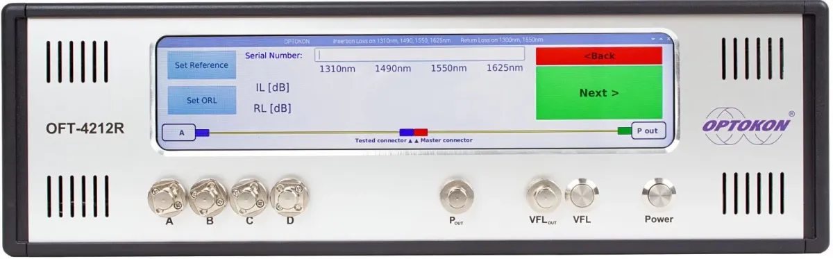 OFT-4212R Fiber Optic 4 Channels Optical Test Station — це автоматизована лабораторна станція для комплексного тестування оптичних конекторів та кабелів з 4 каналами, що поєднує різноманітні джерела світла, модуль вимірювання оптичної потужності, модуль зворотних втрат (Return Loss) і сенсорний дисплей для керування та відображення результатів.