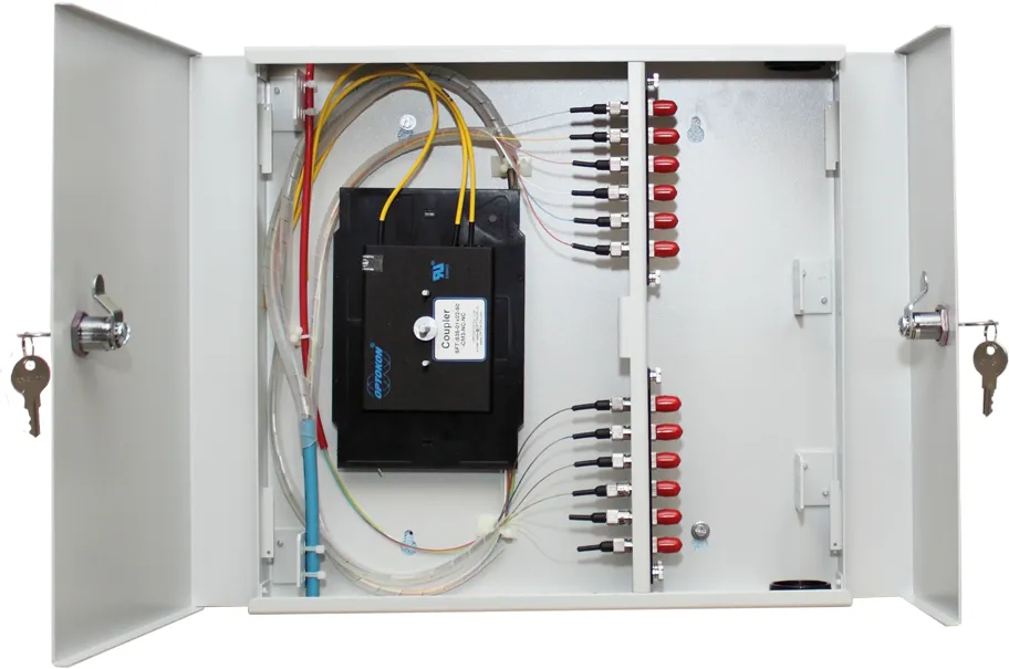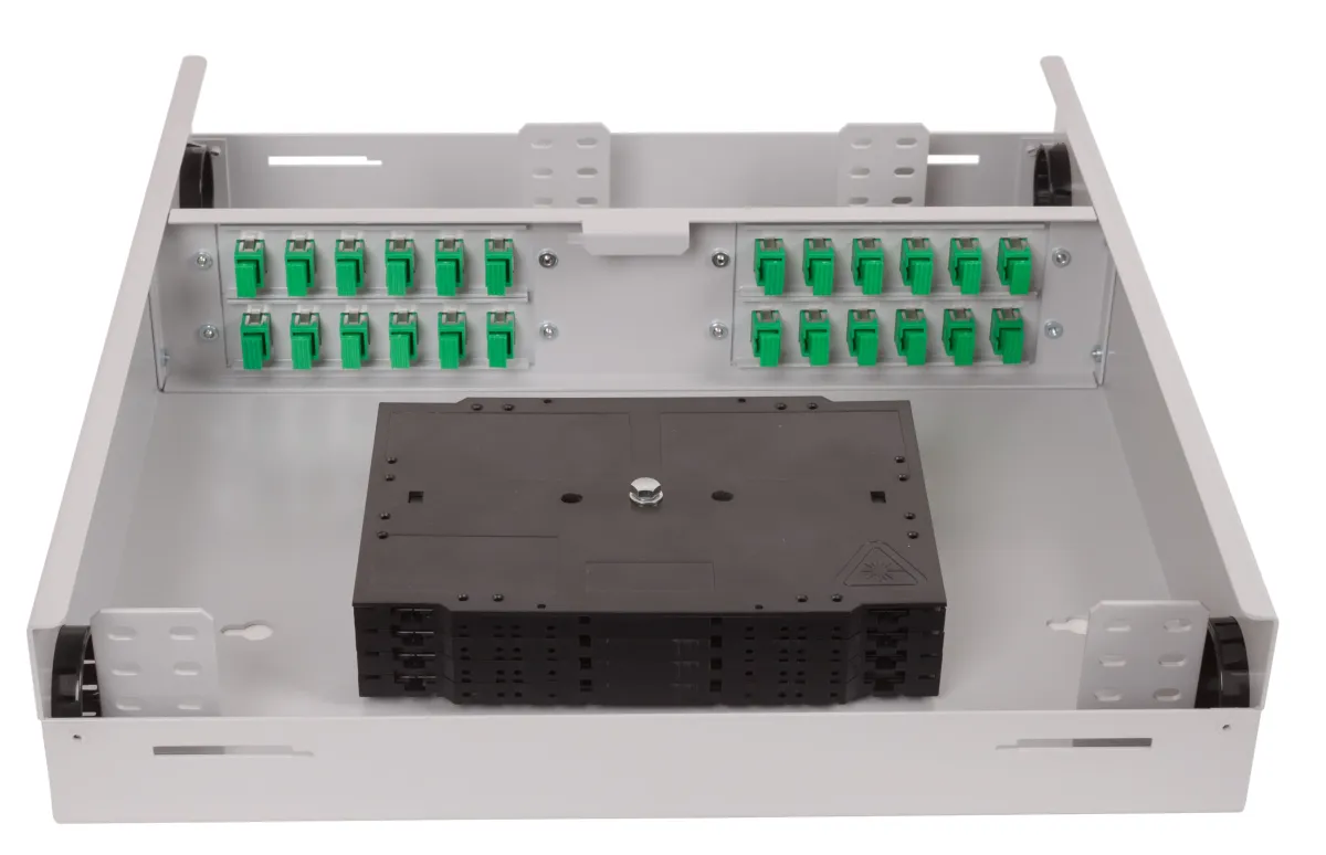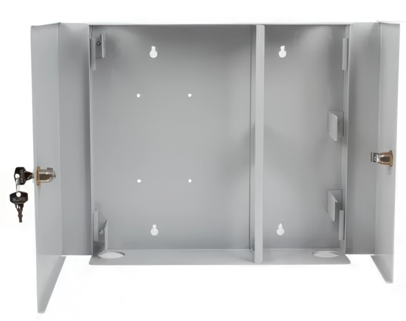 Це настінна оптична шафа для розподілу та комутації волоконно-оптичних кабелів.